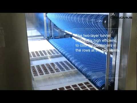 Akışkan haldeki çikolata kalıplara doldurulur, ardından vibrasyon ile kalıba yayma işlemi yapıldıktan sonra soğutma tüneline geçer. Tünelin içerisinde altı ayrı soğutma bölgesi mevcuttur. Tünel nem ve sıcaklık değerlerini sürekli kontrol altında tutan otomasyon çözümleri barındırır. Tünelden çıkan çikolatalar kalıptan çıkarılmak üzere kalıp burkma ünitesine gelir burada kalıptan çıkmaya hazır hale gelen çikolatalar çikolatanın şekline göre hassas pozisyon alabilen iki adet servo kontrollü robot kol yardımıyla vakum vantuzları sayesinde kalıptan alınıp istenen yüzey veya kalıba sırası bozulmadan ve ön yüzleri dönük olarak bırakılır. Bu bırakma işlemi kullanıcı panelinden seçilebilen 3 farklı seçeneğe sahiptir.