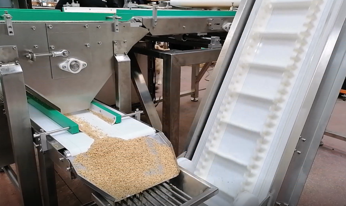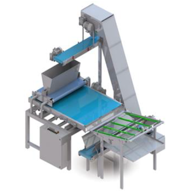 El producto a recubrir es alimentado al sistema por el elevador de transporte y el producto restante a recubrir está diseñado para ser devuelto al sistema.