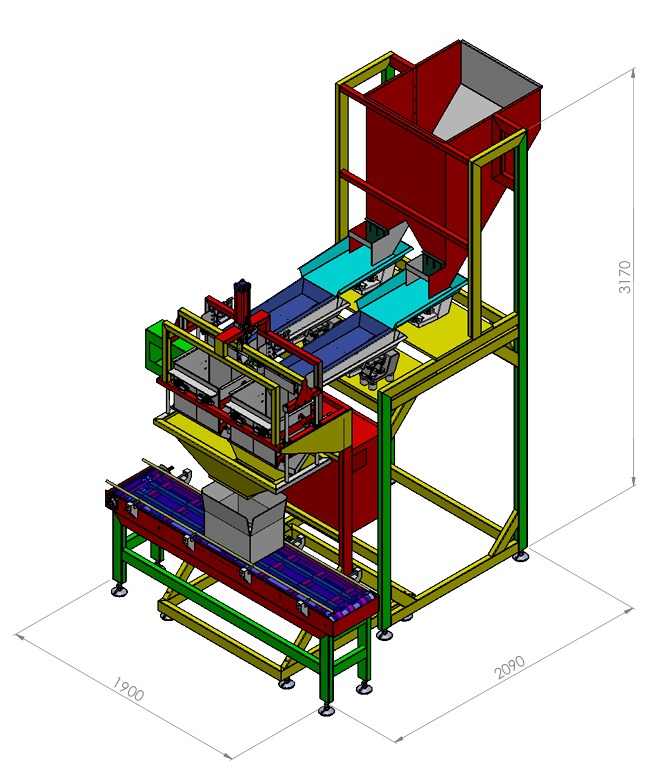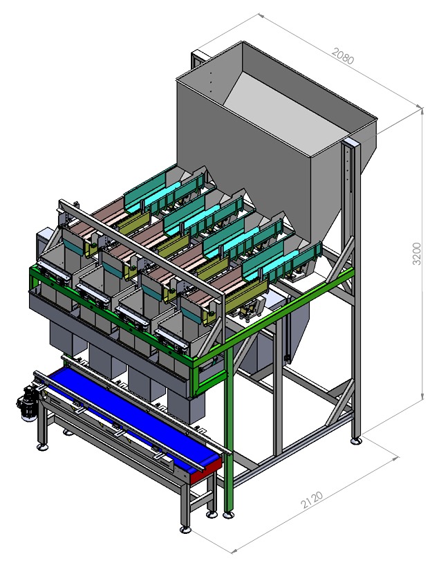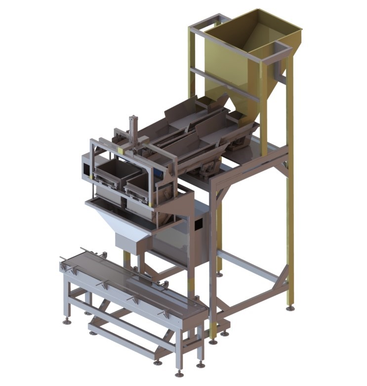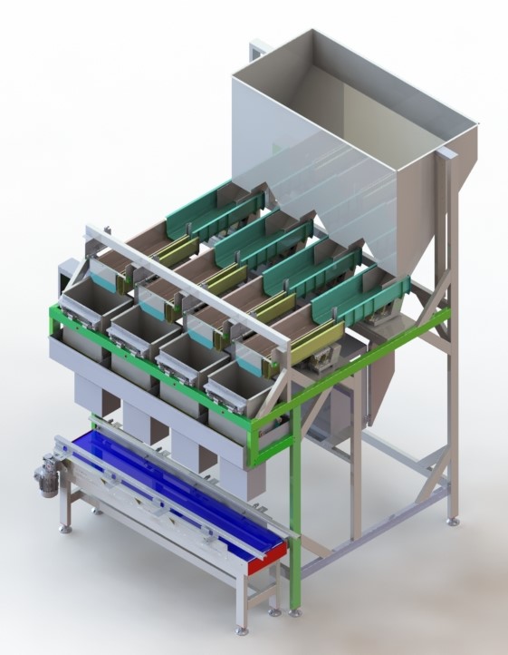 El sistema de pesaje por vibración es una máquina de llenado vibratorio lineal, disponible en versiones de una o varias cabezales, diseñada para el manejo delicado de productos frágiles a granel como frutos secos pequeños, frutas deshidratadas y caramelos. Garantiza una dosificación precisa y minimiza el daño al producto al mantener una altura de caída muy baja durante todo el proceso de llenado. Está equipada con un sistema de tres bandejas vibrantes: una para extraer el producto del depósito, una bandeja más grande para el llenado grueso y una más pequeña para la dosificación fina. Esta estructura permite mantener un flujo constante de producto y redirige automáticamente el exceso desde la bandeja de dosificación fina hacia la bandeja de llenado grueso. El llenado bruto se realiza directamente dentro de la caja colocada sobre una báscula, lo que reduce la altura de caída y evita que el producto se adhiera en la tolva de pesaje. La dosificación fina se lleva a cabo en una tolva de pesaje separada, lo que garantiza un control preciso y minimiza el goteo posterior, aumentando la exactitud del llenado. Diseñada para productos frágiles de hasta 60 x 60 x 60 mm, la máquina incluye de serie una pantalla táctil a color para una operación fácil e intuitiva. Puede alcanzar una producción de hasta cinco cajas por minuto, dependiendo del tipo de producto y del peso objetivo. Funciona con una potencia instalada de 3 kW, a 3 x 400 V + N + E / 50 Hz, requiere una presión de aire de 6 bar y consume 1 Nl por ciclo. El peso total de la máquina es de aproximadamente 700 kg. Se pueden personalizar los tamaños de cajas y contenedores. Para más opciones, por favor contacte con Innovas.